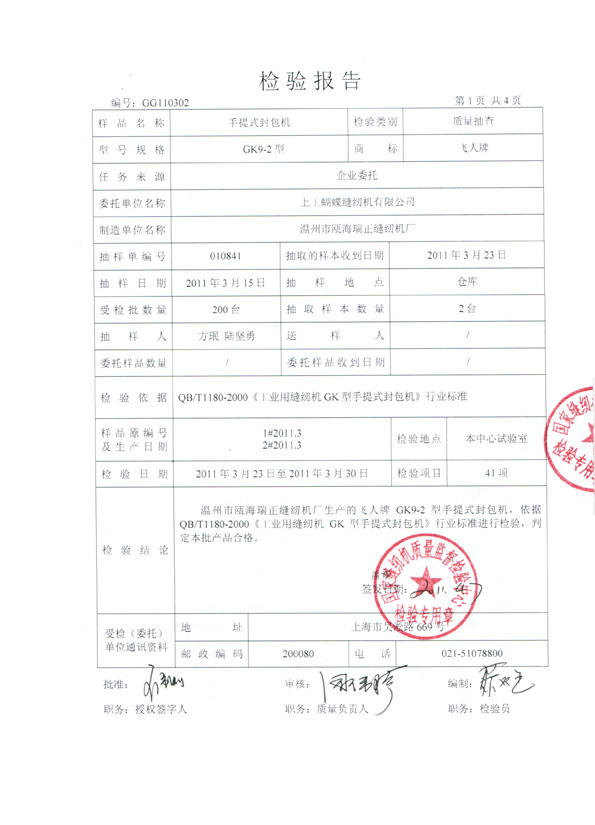 本廠GK9係列封包機通過國家縫紉機質量監督檢驗中心檢測,檢測標準:QB/T1180-2000《工業用縫紉機GK型手提式封包機》